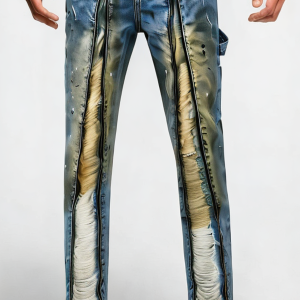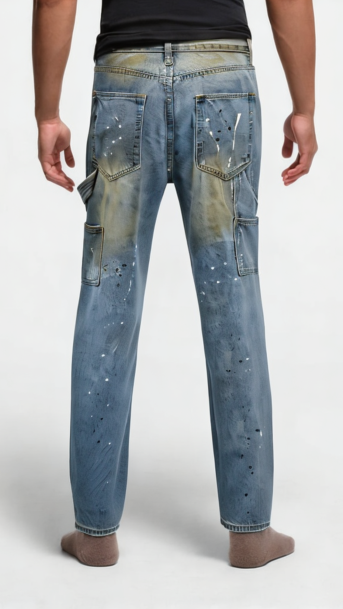 White dot splash design: This pair of jeans has a white dot splash effect on the trouser surface, simulating the effect of graffiti or hand-splashed ink, adding an irregular sense of art, making the overall design more dynamic and creative.