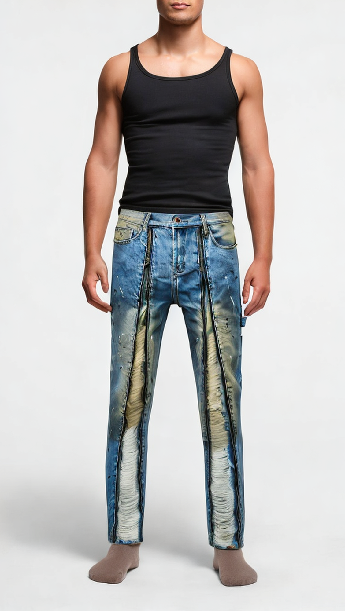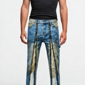 Decorative zipper design: The zipper extends from the waistband to the hem of the trousers. As a decorative element, it breaks the monotony of traditional jeans and adds an avant-garde and personalized design sense. The decoration of the zipper has a unique visual effect and avant-garde sense, which enhances the street style of the jeans.