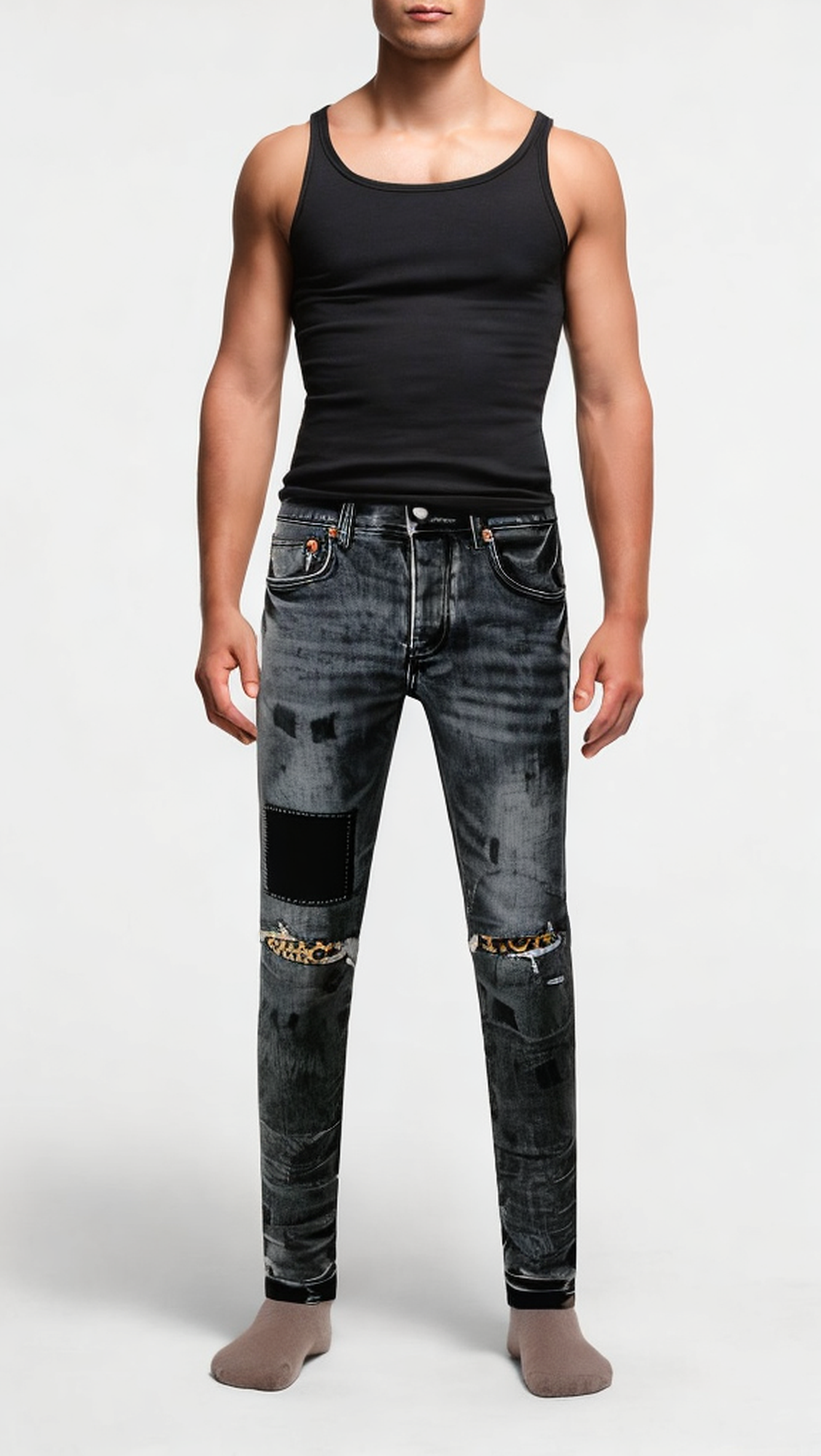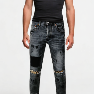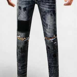 Leopard print stitching: Leopard print elements symbolize wildness and unruliness, and are a classic pattern in fashion trends. Adding leopard print stitching to the knee tear not only enhances the visual impact of jeans, but also forms a style of rebellion and luxury. This design is especially suitable for men who pursue street fashion, rock style or trendy personality, making the overall look more eye-catching.