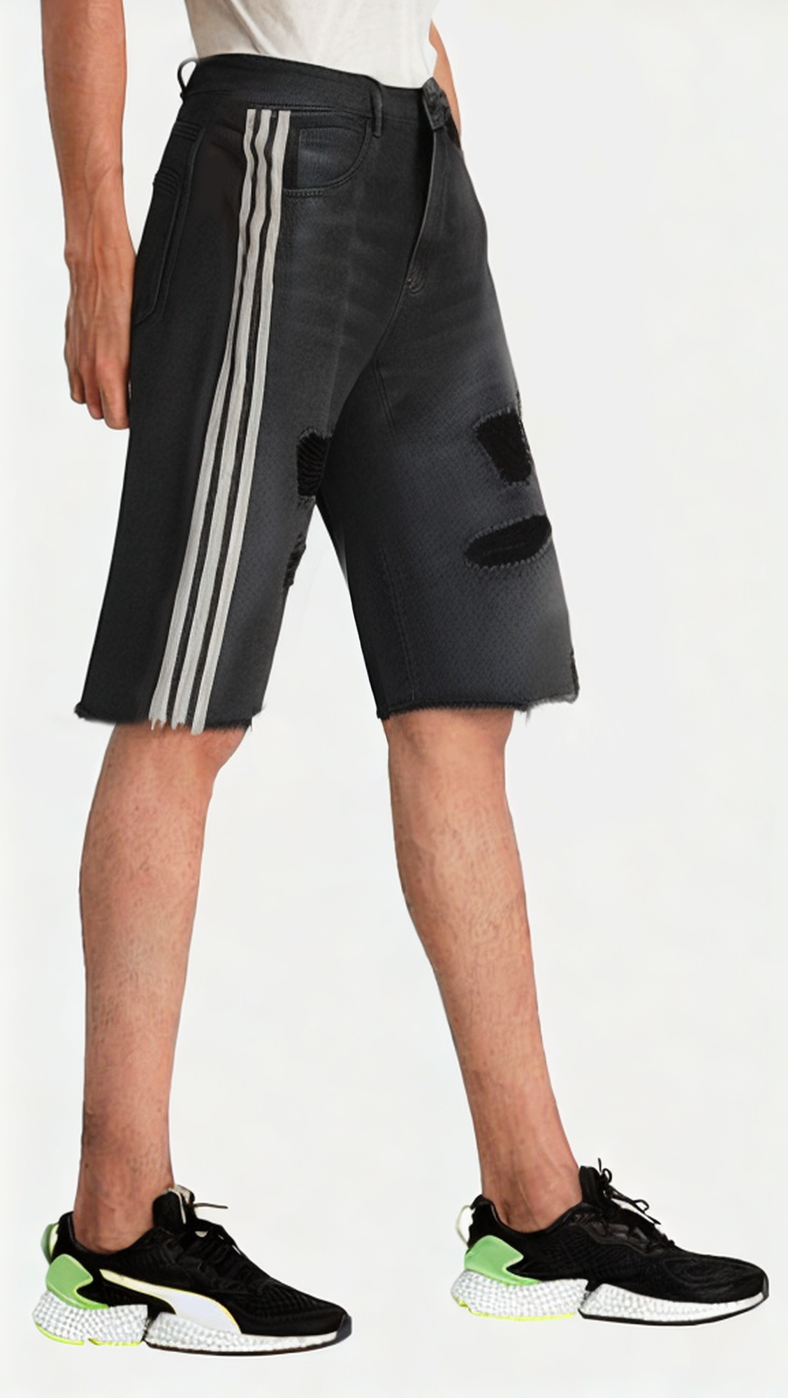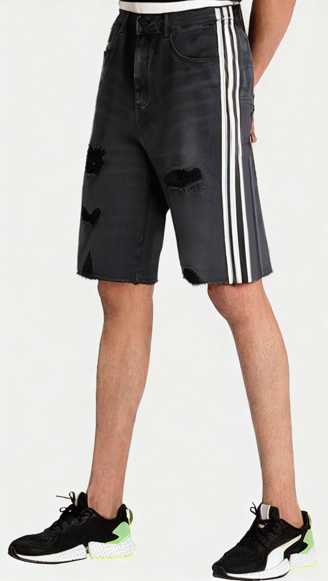 This stylish mid-length jeans with its unique hem side stripes and silk hole design creates an eye-catching street style for modern men. Combining trendy elements and comfortable wearing experience, it is suitable for various casual occasions, adding a sense of personality and fashion to your summer look.