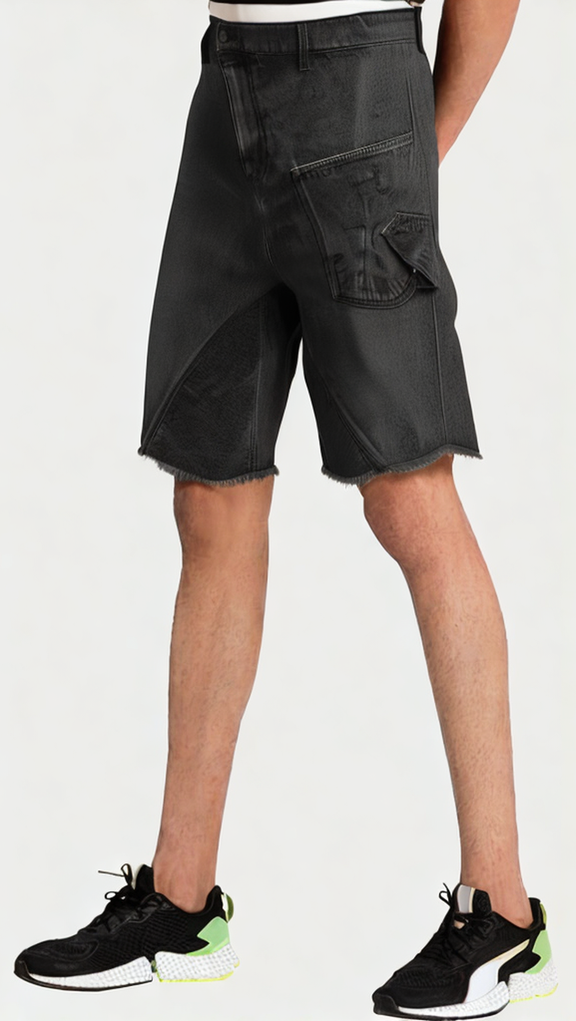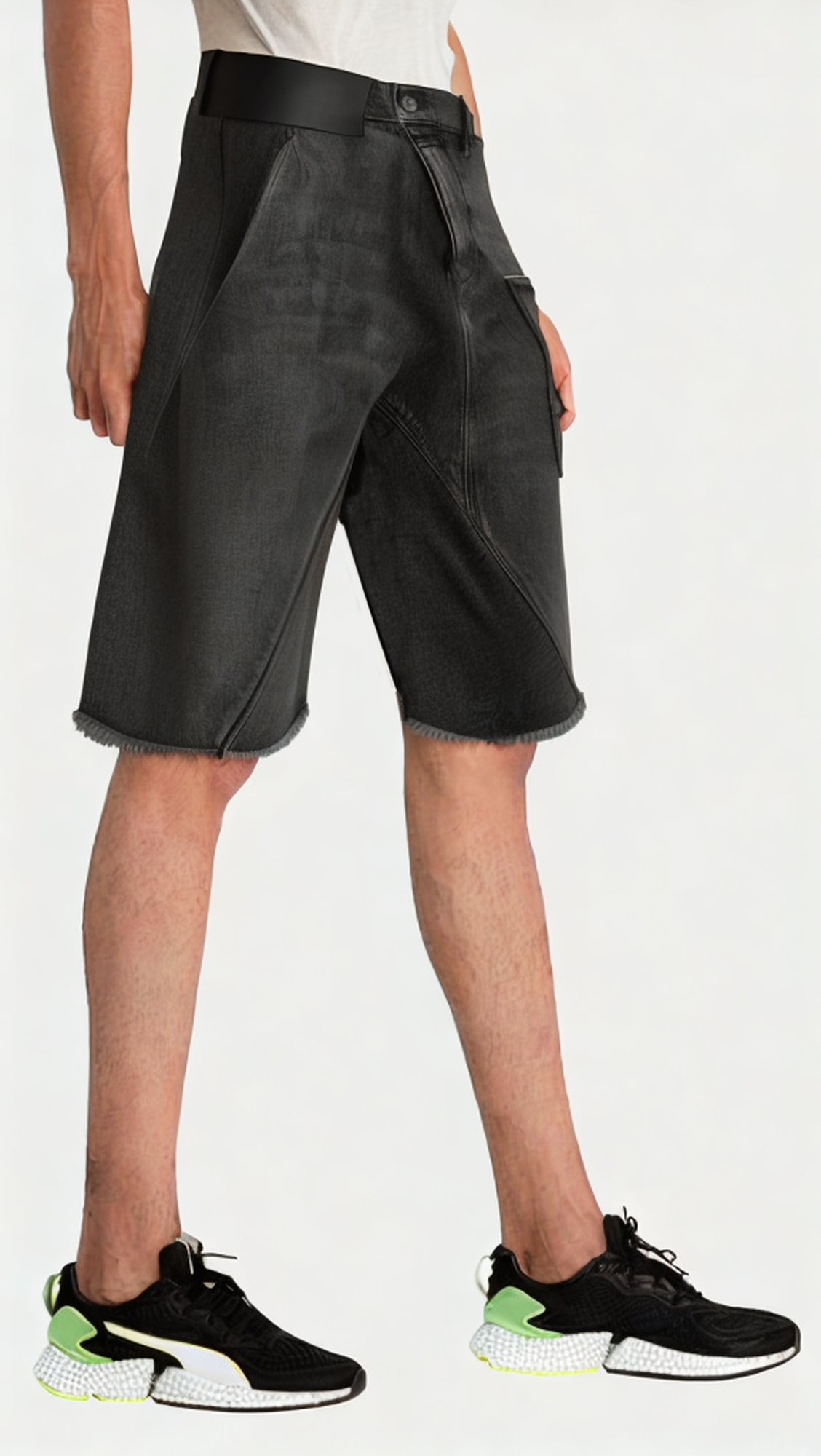 This men’s washed grey denim shorts features an asymmetrical design and ultra-wide hem raw edges, creating a unique street fashion style. The low waist design and above-knee length make it a must-have fashion item in summer, suitable for you who pursue individuality and comfort. The 3 pockets design not only enhances practicality, but also adds a sense of layering to the overall shape.