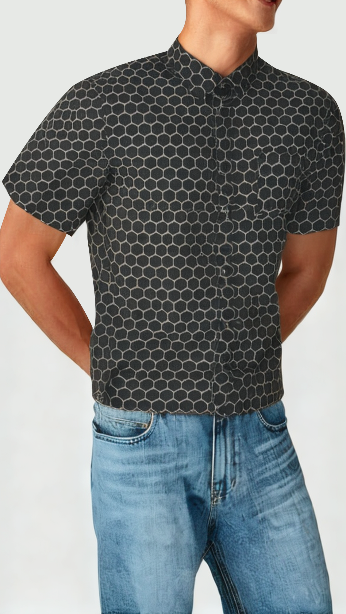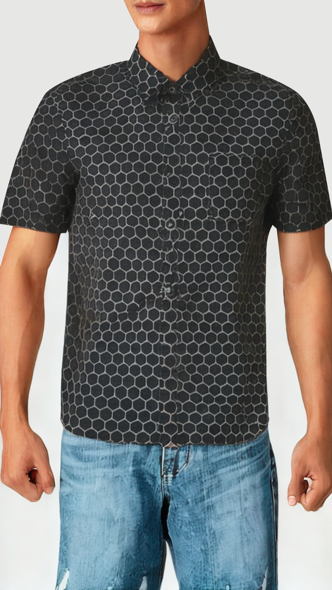 Honeycomb plaid design: The unique honeycomb plaid print gives the shirt a layered and modern feel, while showing a fashionable Hawaiian style.