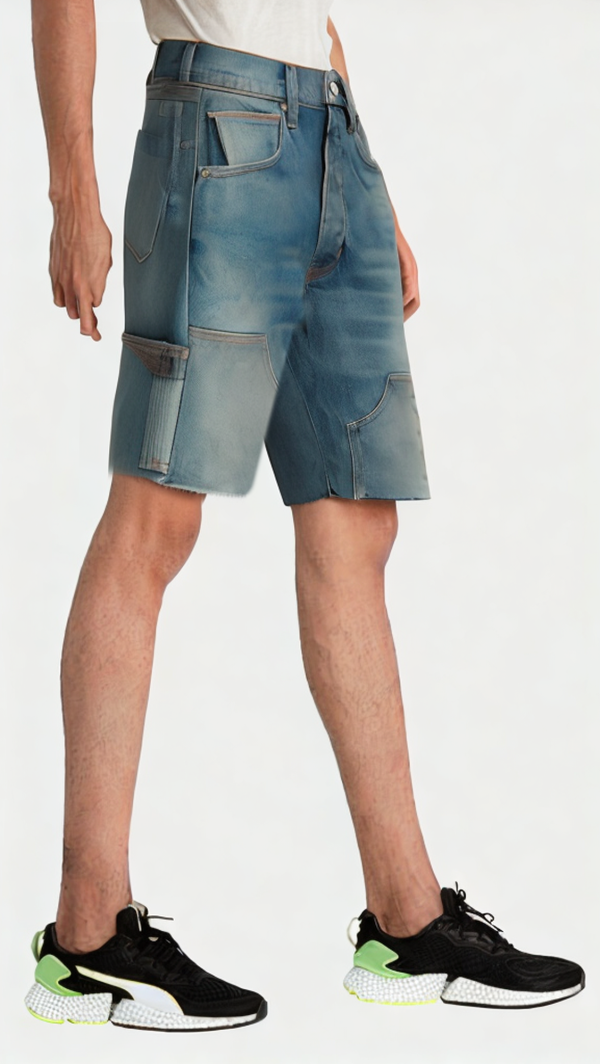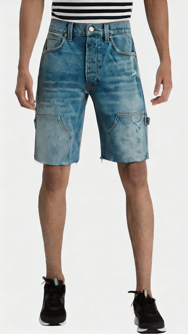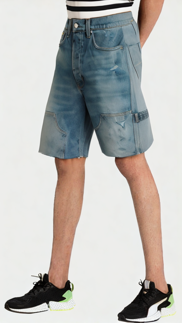 This retro indigo washed denim shorts perfectly interprets street style and retro charm with its unique design and distressed details. The double knee design and frayed hem add a casual and personalized style, suitable for men who pursue fashion and comfort.